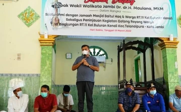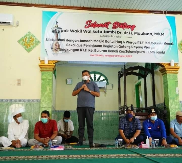 Jambi JBC- Anggota DPRD kota Jambi Kemas Faried Alfarelli bersama Wakil Walikota Jambi de.Maulana Mekuniungi sekaligus silahturahmi dengan jamaah masjid Baitul Haq di RT.11 Kel.buluran Kenali Sabtu, (19/3).