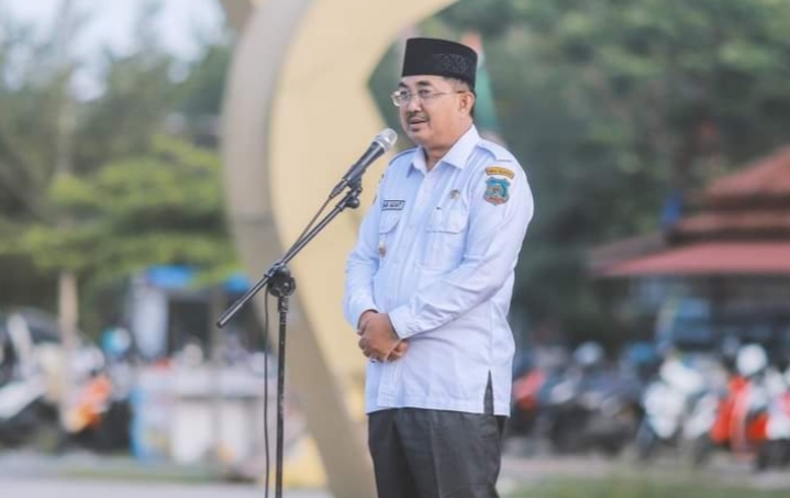 TanjabBarat-Bupati Tanjung Jabung Barat H. Anwar Sadat memimpin apel pagi hari pertama masuk kerja pasca libur lebaran Idul Fitri 1444 H, Rabu (26/4) di Laman Orang Kayo atau Alun-alun Kuala Tungkal .