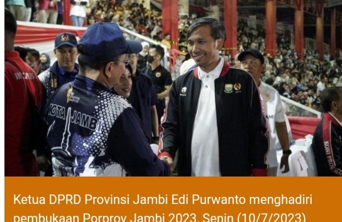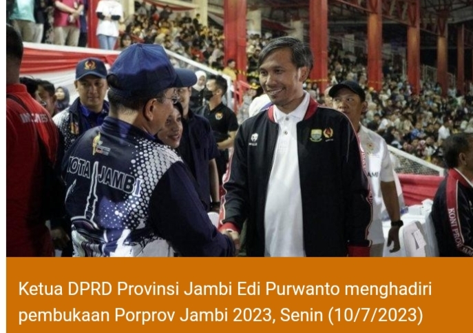 JAMBI-Ketua DPRD Provinsi Jambi Edi Purwanto menghadiri pembukaan Pekan Olahraga Provinsi Jambi (Porprov Jambi) ke XXIII yang digelar di Stadion Tri Lomba Juang pada Senin (10/7/2023) malam.